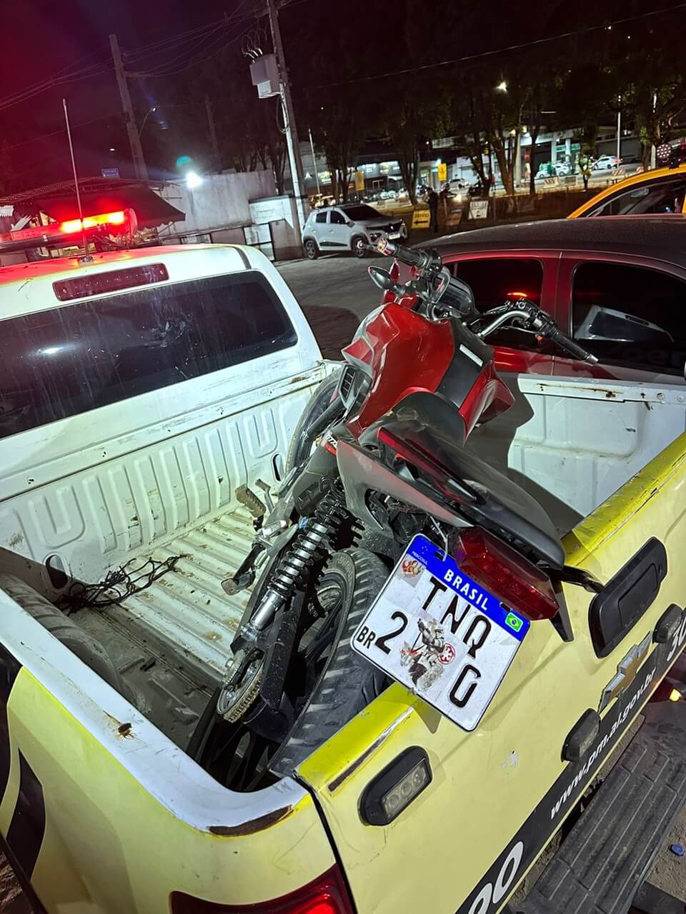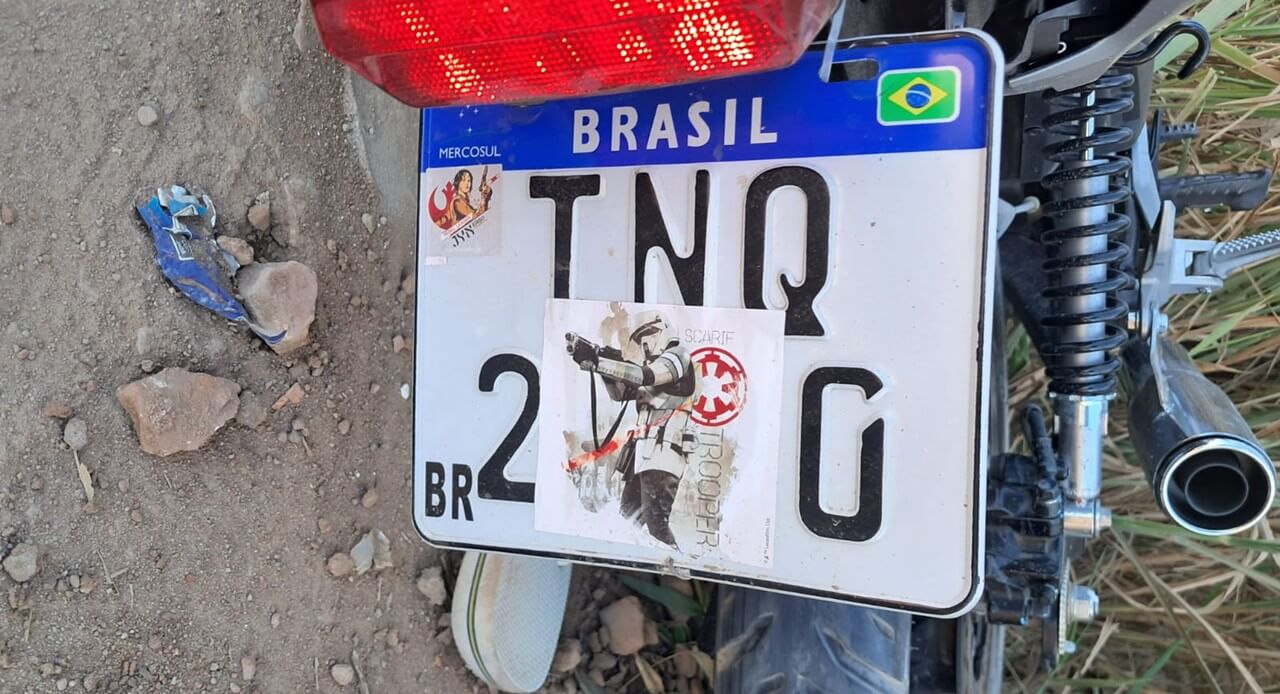 De acordo com o boletim de ocorrência, a guarnição da Supervisão, em patrulhamento próximo à localidade conhecida como Destilaria, avistou dois indivíduos em uma motocicleta sem capacetes e com a placa adesivada.