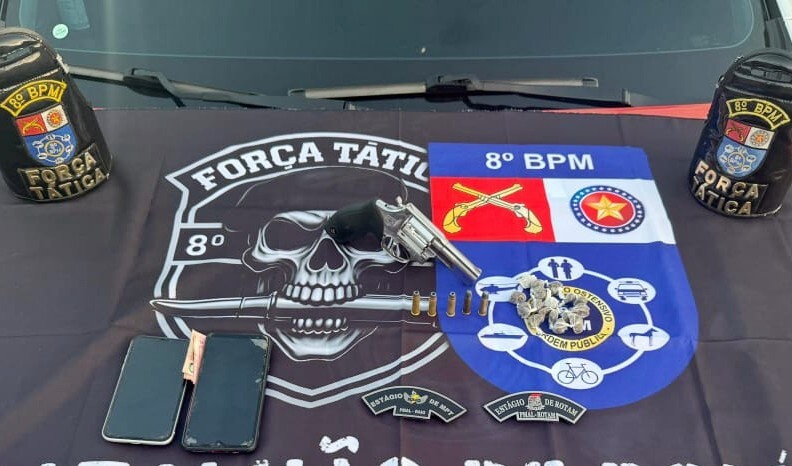 Ao chegar ao local, os policiais perceberam o forte odor de maconha vindo do interior da residência. Pela abertura da porta, segundo a PM, foi possível visualizar o trio reunido na sala, além de porções de maconha fracionadas para venda e um revólver exposto sobre o sofá da casa.