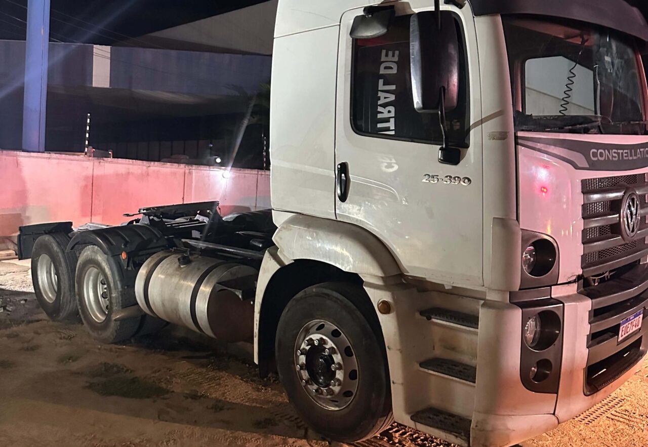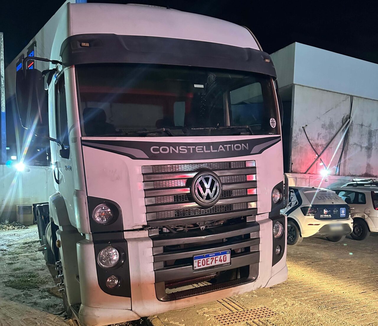 A equipe policial visualizou um caminhão trator VW/19.320, branco, placa EOE7F40/SP, cuja situação já havia sido sinalizada como suspeita, após informações recebidas sobre um possível furto em Pernambuco.