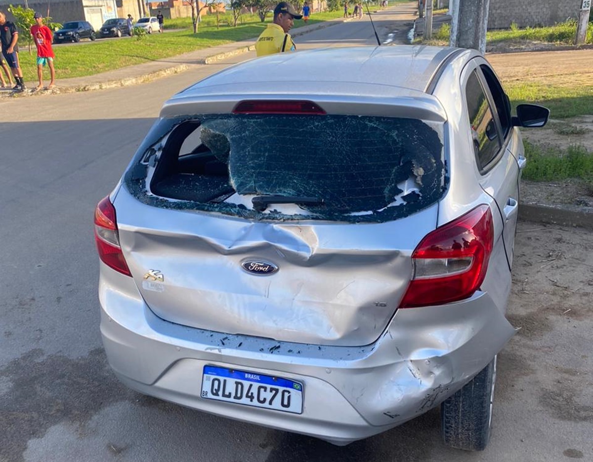 A força do impacto destruiu o para-brisas traseiro, a tampa da mala e o para-choques do carro de passeio e deixou os dos menores feridos.