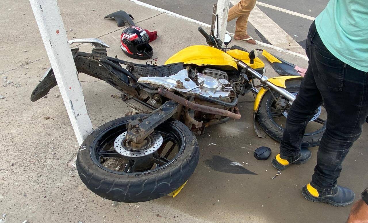 A colisão envolveu um veículo de passeio modelo Volkswagen Gol e uma motocicleta ocupada por duas pessoas.