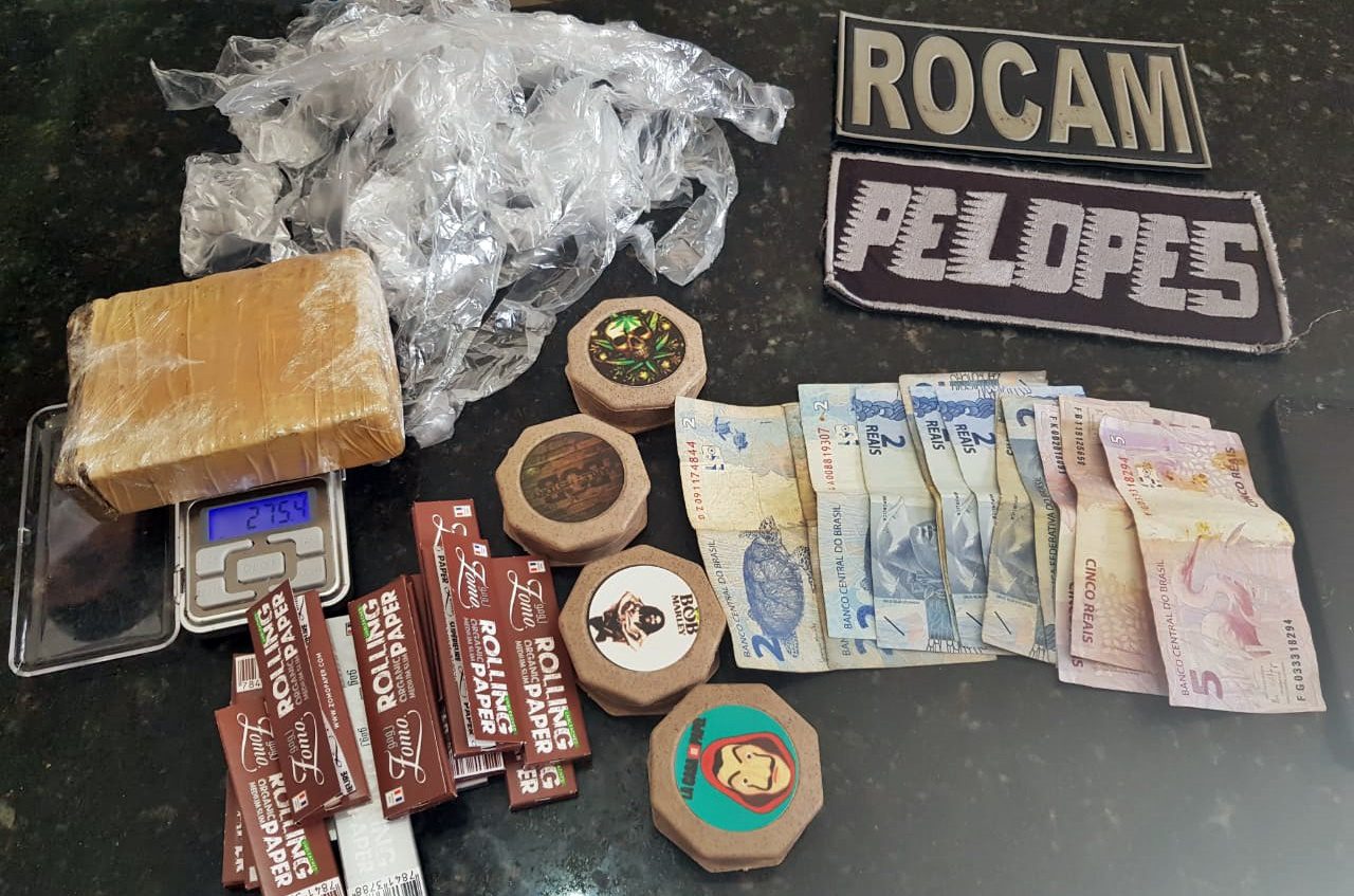 Com autorização do proprietário da casa, a PM realizou buscas e, dentro de um cesto de roupas, descobriu 275g de maconha, uma balança de precisão, 15 tablets de papel seda e quatro trituradores de substância e embalagens. R$ 41,00 em dinheiro também foi apreendido.