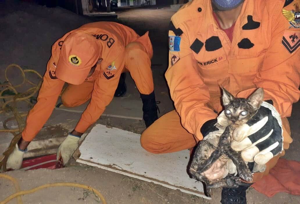 Uma equipe do Corpo de Bombeiros Militar de Alagoas (CBM/AL), trabalhou no final da noite desta quarta-feira (10), para resgatar um gato que caiu numa fossa séptica no loteamento Hélio Jatobá, na parte alta de São Miguel dos Campos.