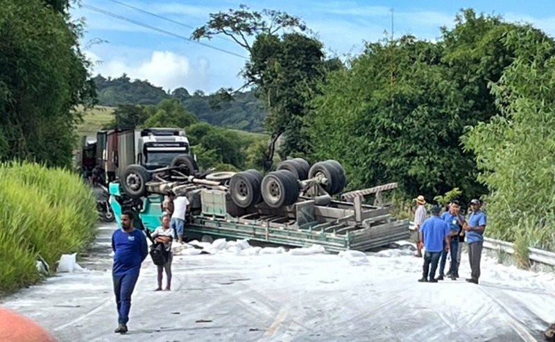 Um caminhão Mercedes Benz, de cor azul, placa não informada, tombou após colidir com um veículo de passeio na manhã desta terça-feira, dia 17, e deixou interditado um trecho da rodovia federal BR-101 no município de Joaquim Gomes, no interior de Alagoas.