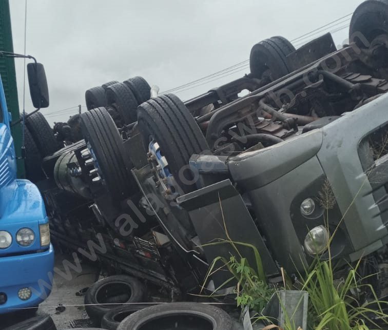 O condutor de um caminhão ficou ferido, no final da noite desta sexta-feira (03), após o veículo tombar no acesso a BR 101, no viaduto que liga a rodovia federal a AL 220, sentido Barra de São Miguel.