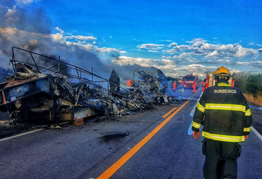 Uma carreta, de modelo e placa não informado, ficou completamente destruída após pegar fogo no final da tarde desta sexta-feira (03), na rodovia federal BR 423, no município de Ouro Branco, no interior de Alagoas.