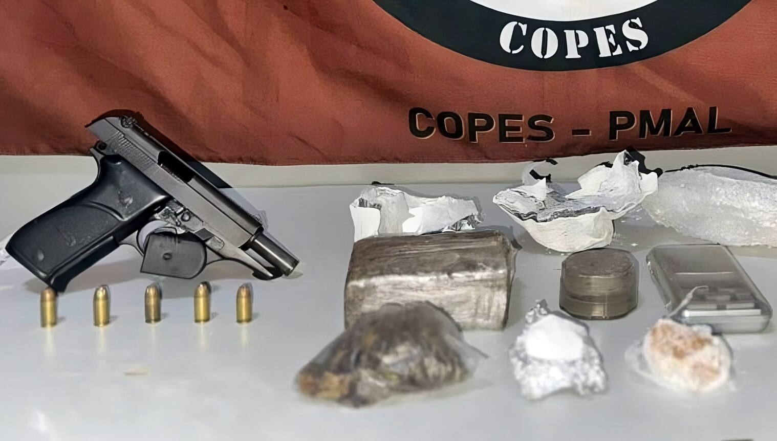 Durante a abordagem, os agentes apreenderam 116 gramas de cocaína, 245 gramas de maconha e 23 gramas de crack, além de uma balança de precisão, um aparelho celular e uma pistola Bersa calibre 380 com cinco munições intactas.