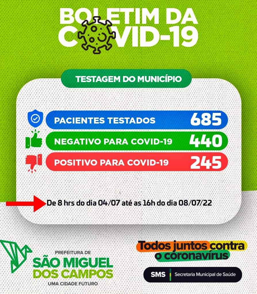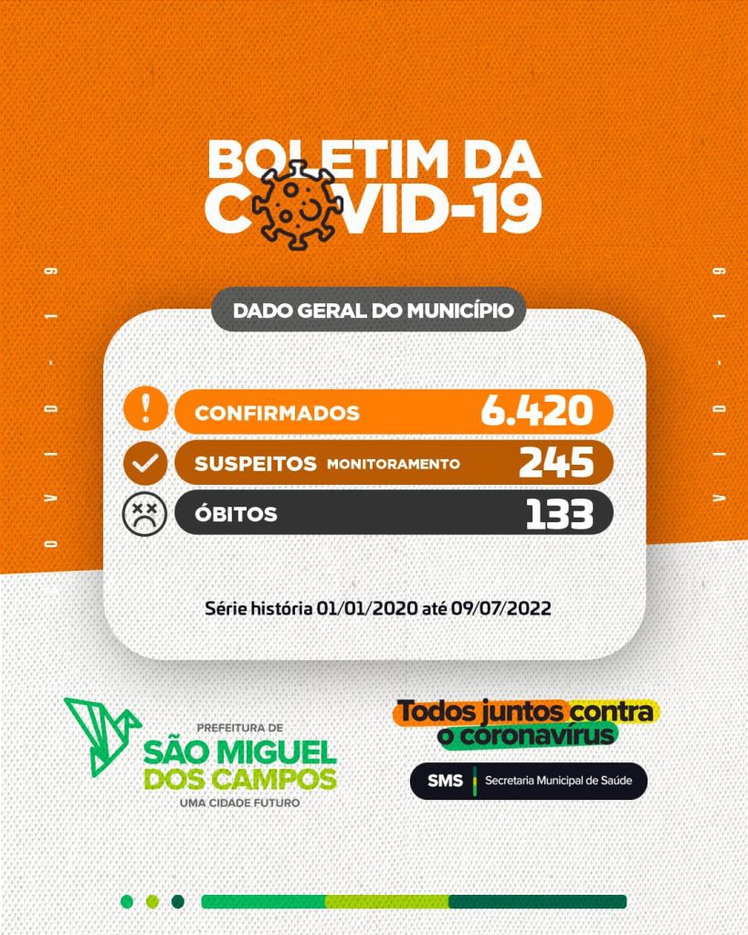 De acordo com o último boletim divulgado, entre os dias 4 e 8 de julho, São Miguel dos Campos testou mais de 680 pessoas com 245 casos positivo para Covid-19 e 440 negativos. Outros 245 estão sendo monitorados.