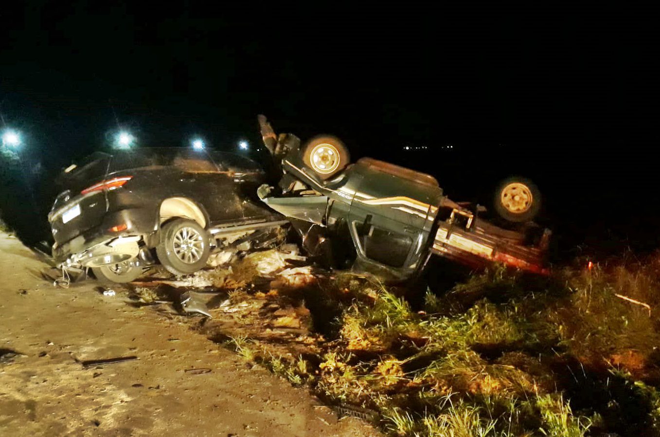 Com o choque, ainda segundo o BPRv, a Chevrolet foi jogada para fora da pista e colidiu contra uma cerca de arrame e um poste de transmissão de energia. Os dois homens feridos foram levados para o Hospital de São Sebastião.