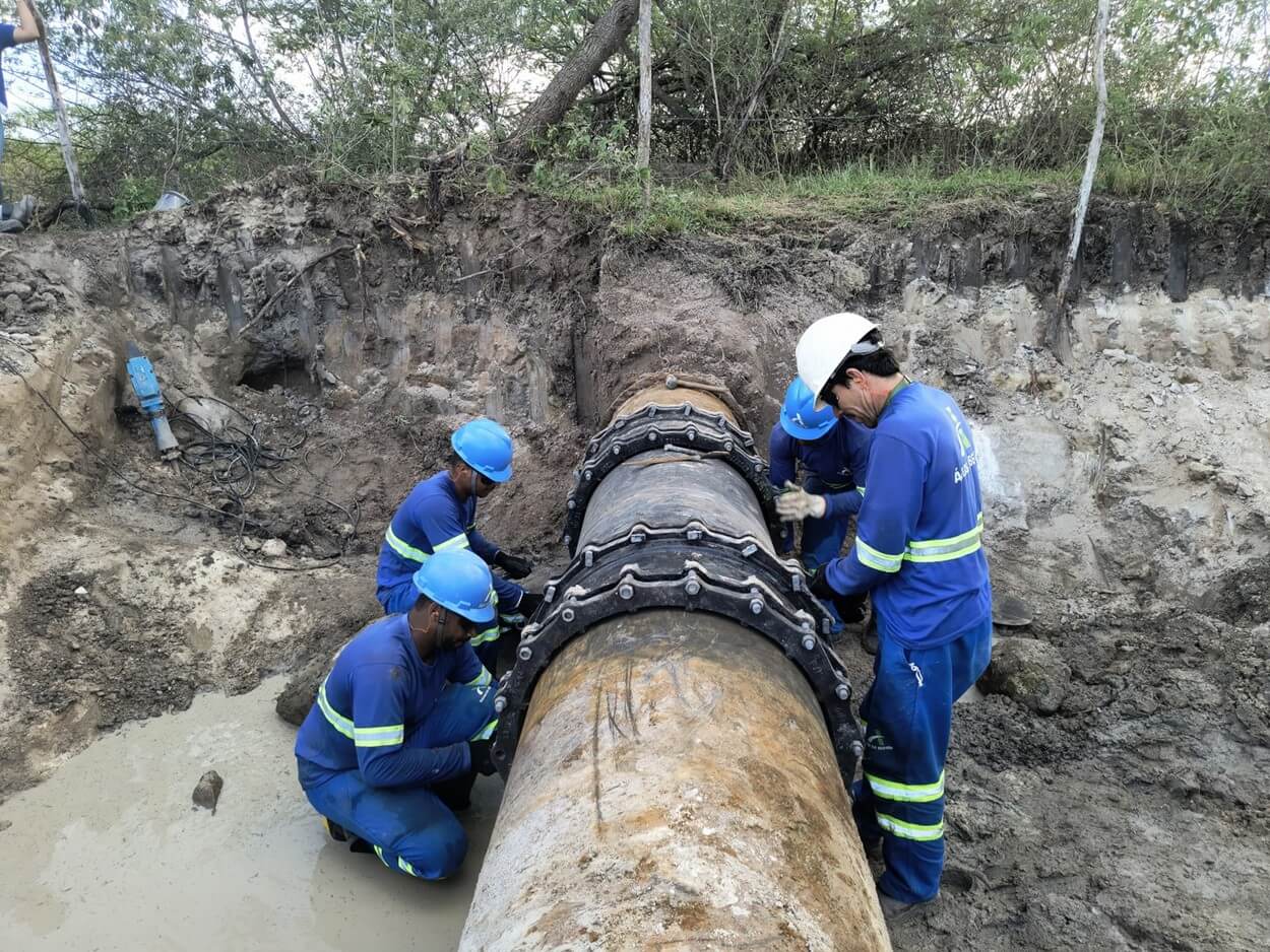 As atividades incluem três frentes de trabalho. A primeira consiste na reativação de 12 descargas no sistema tronco DN 700, medida fundamental para melhorar o controle do fluxo de água na adutora principal. As descargas são essenciais para realizar limpezas periódicas do sistema.