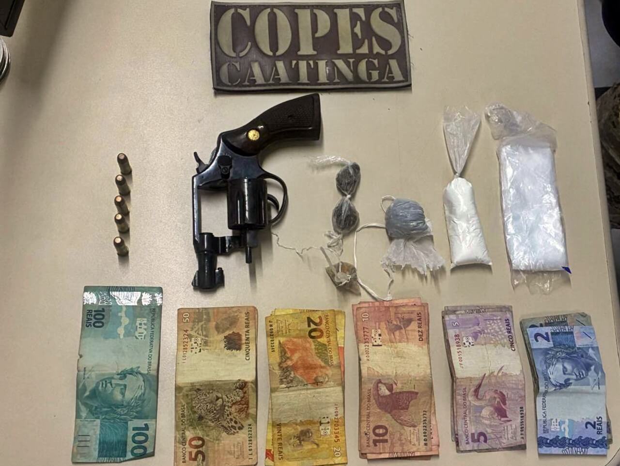 Na ação, a Copes apreendeu, 25 gramas de cocaína, 12 gramas de maconha, 5 gramas de crack, um revólver Taurus calibre 38 e cinco munições do mesmo calibre, além de R$ 466,00 em dinheiro.