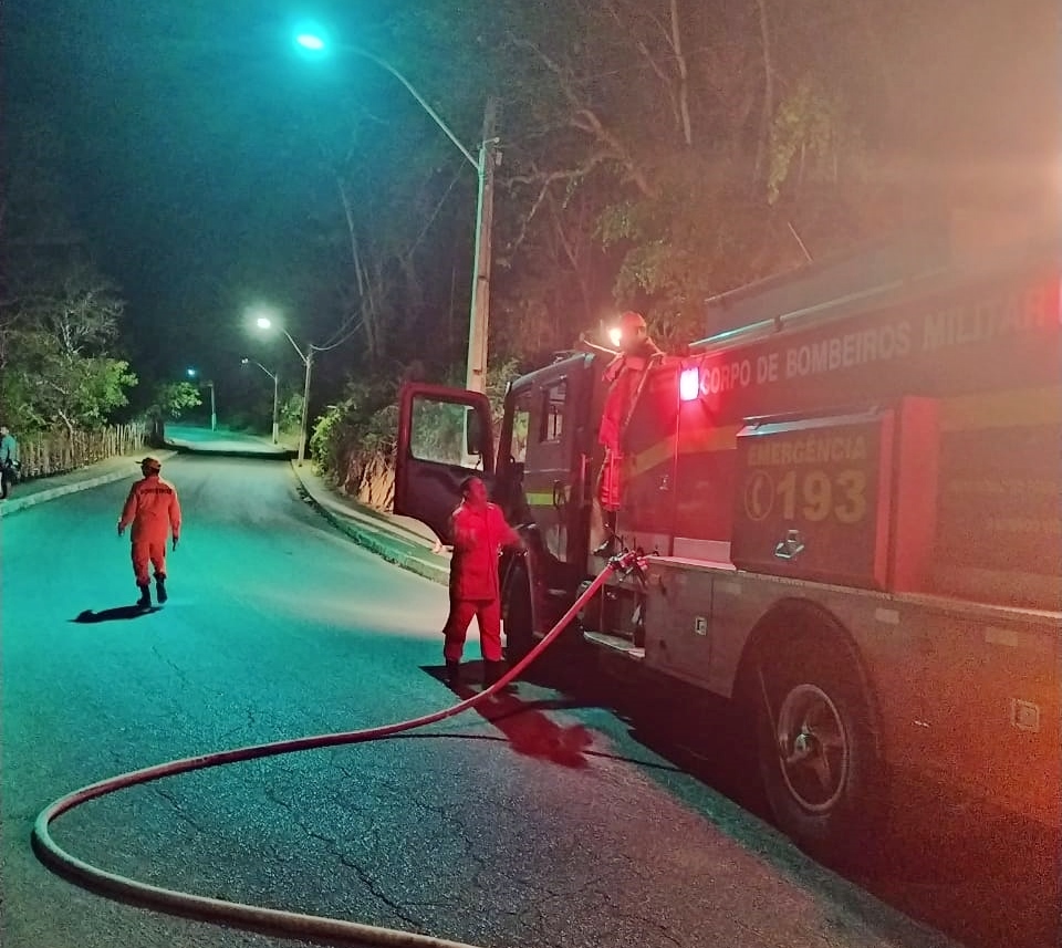 sete militares, trabalha na noite desta terça-feira (28), para apagar um incêndio