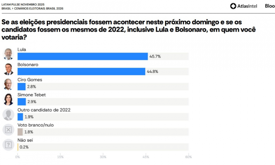 A pesquisa também projetou cenários para a disputa presidencial de 2026. Em um eventual primeiro turno entre os mesmos candidatos de 2022, Lula aparece com 45,7% das intenções de voto, tecnicamente empatado com Jair Bolsonaro, que registra 44,8%.