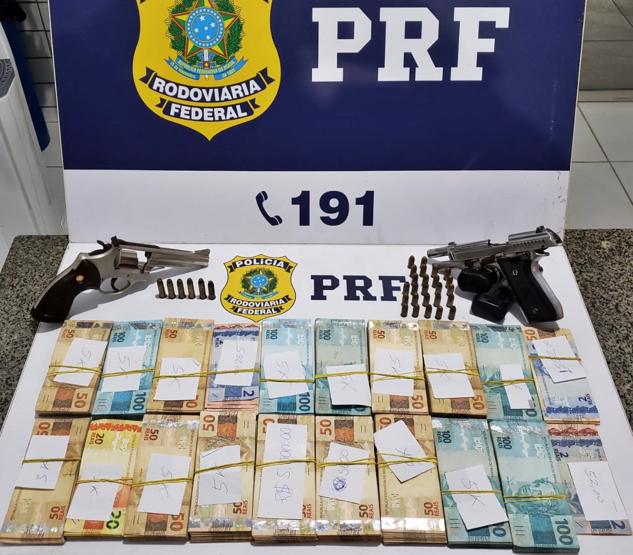 Desconfiados, os PRFs realizaram uma busca no interior do veículo, onde encontraram dois revólveres da marca Taurus, calibre 35 e 38, munições para ambos e o valor de R$ 82.276 em dinheiro.