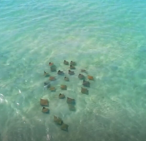 As imagens, registradas por drone pelo criador de conteúdo digital @papitoofc1, mostram dezenas de arraias deslizando pelas águas mornas e cristalinas da região.