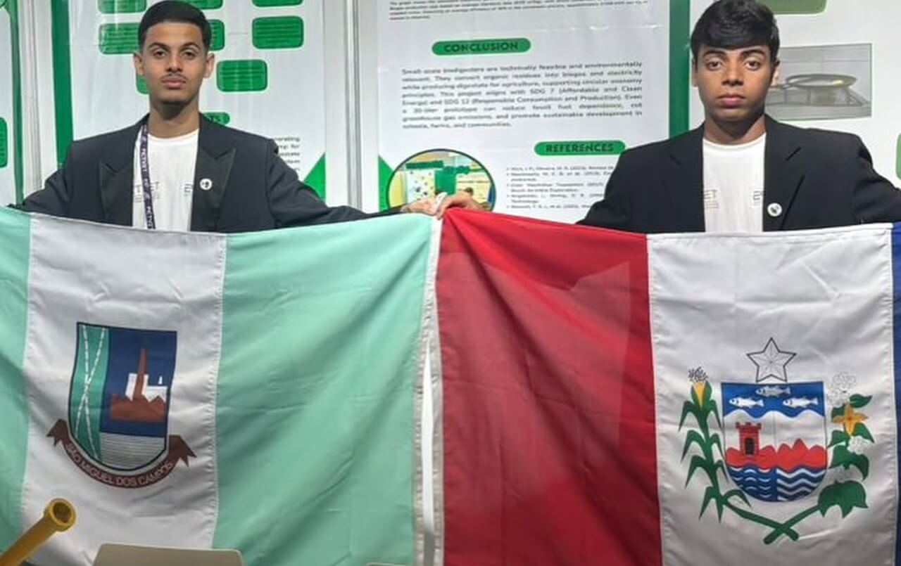 Dois jovens estudantes de São Miguel dos Campos, no interior de Alagoas, estão fazendo história e levando o nome do Brasil para o mundo. João Pedro e Kaymi Pablo, alunos orientados pelos professores Marília Oliveira e Carlos Wilker, participam da Milset Expo-Sciences International 2025 (ESI 2025), considerada a maior feira de ciências e tecnologia do planeta, realizada em Abu Dhabi, nos Emirados Árabes Unidos.