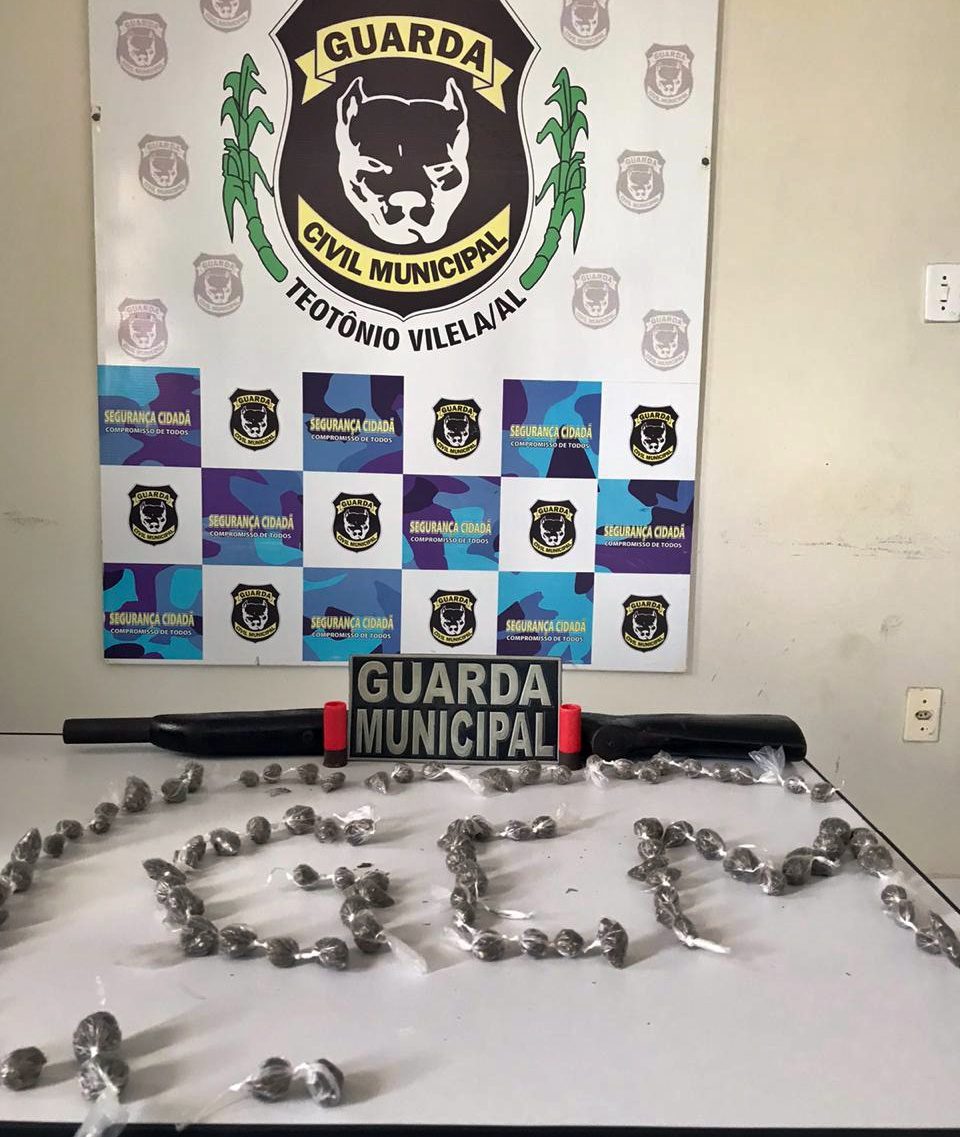 Dois homens foram presos, neste domingo (25), durante uma ação da Guarda Civil Municipal (GCM) de Teotônio Vilela. Além de 100 bombinhas de maconha, uma espingarda calibre 12, com três munições foi apreendida.