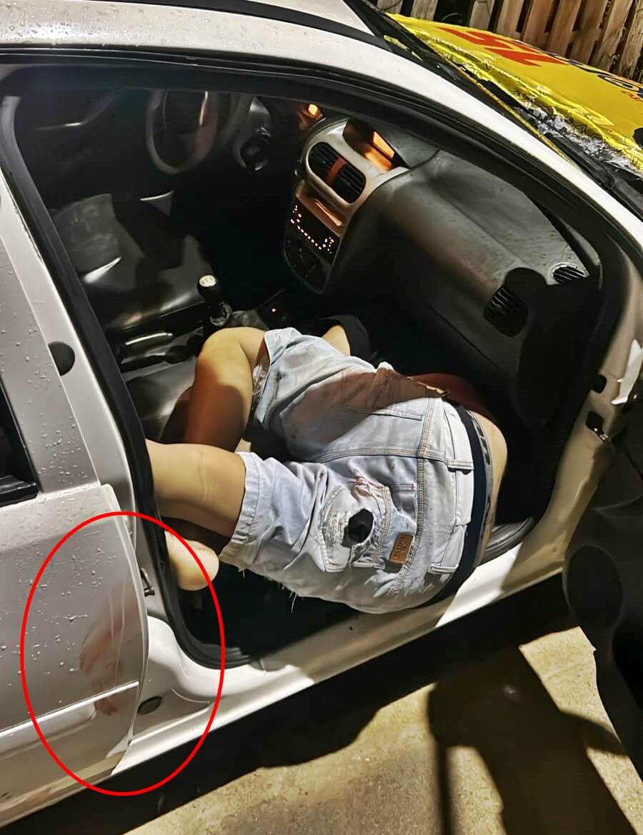 Marcas de sangue foram encontradas na lateral do veículo e na roupa da vítima, mas a PM aguarda a perícia para confirmar se o indivíduo realmente foi atingido por disparos de arma de fogo.