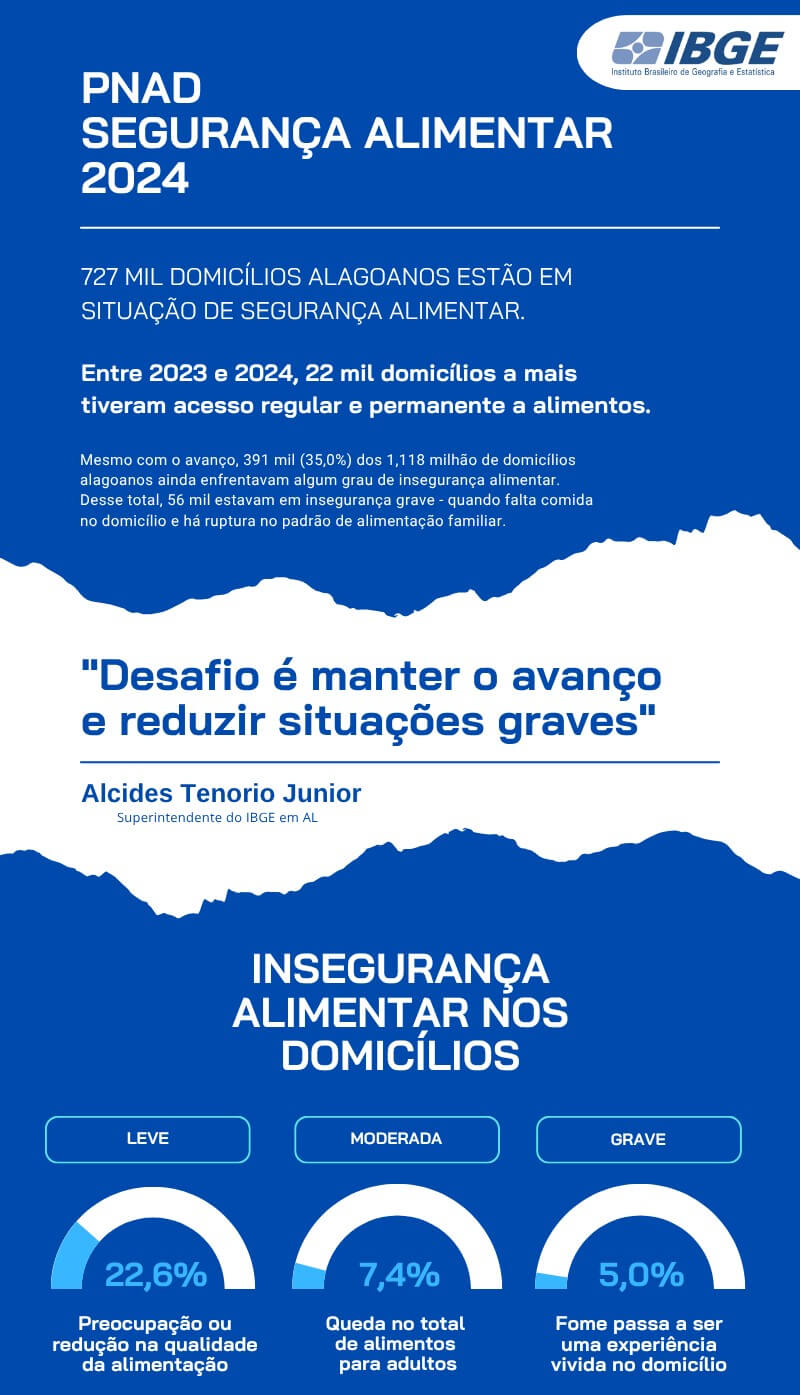 “Os dados indicam um cenário de recuperação no estado de Alagoas, mas ainda com um contingente expressivo de domicílios em insegurança alimentar. O desafio é manter o avanço e reduzir as situações mais graves”, destaca Alcides Tenorio Junior, superintendente do IBGE em Alagoas.