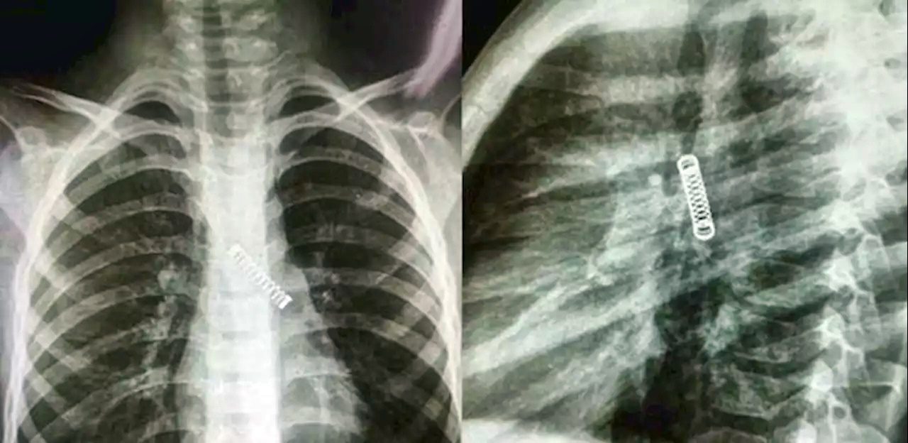 O menino foi submetido a um raio-X e os médicos ficaram surpresos ao encontrar um objeto de metal em seu pulmão esquerdo.