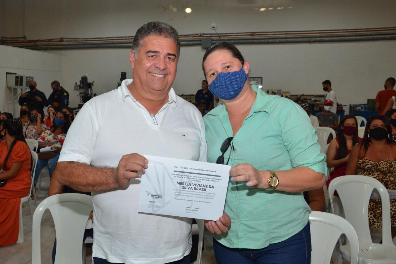 Finalizando as primeiras turmas dos cursos profissionalizantes e do curso “Arte à Mão”, que foram iniciados no primeiro semestre, a Prefeitura de São Miguel dos Campos, através da Secretaria Municipal de Desenvolvimento Econômico, da Ciência, da Tecnologia e Inovação (SEDECTI), realizou nesta sexta-feira (30), a entrega dos certificados aos alunos.