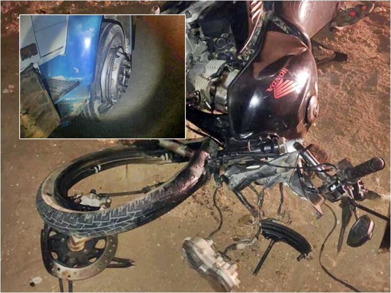 Com o choque, o pneu do caminhão estourou e a moto ficou completamente destruída.
