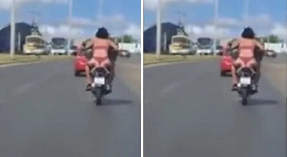 Uma mulher não identificada foi filmada viajando na garupa de uma moto usando apenas calcinha e sutiã em Cidade Ocidental, no interior de Goiás. A cena foi gravada por um motorista trafegava na região.