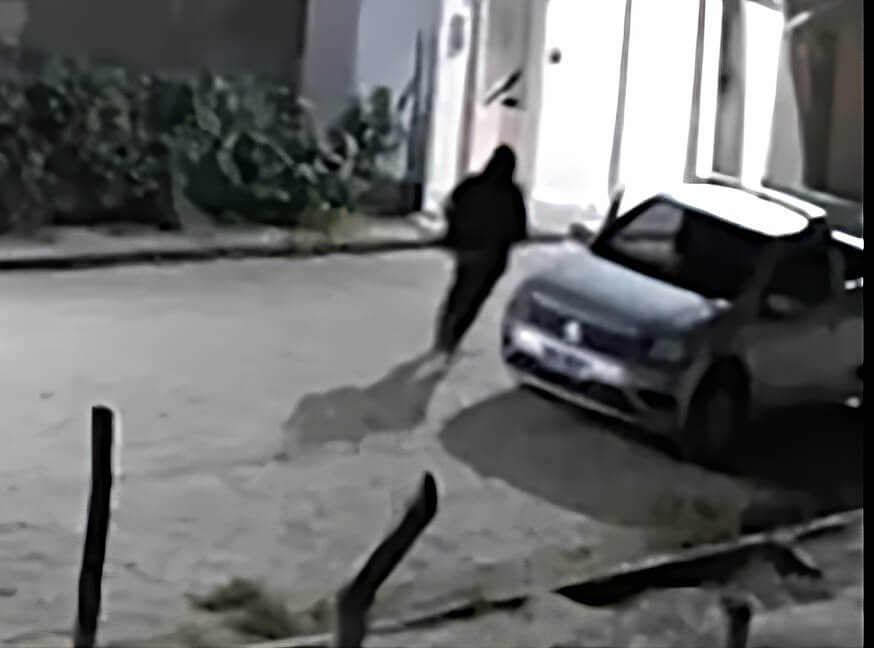 Nas imagens o criminoso deixa a casa logo após efetuar os disparos contra a vítima. O homem, usando capuz, foge em um veículo modelo Volkswagen Saveiro, cor prata, tomando destino ignorado.