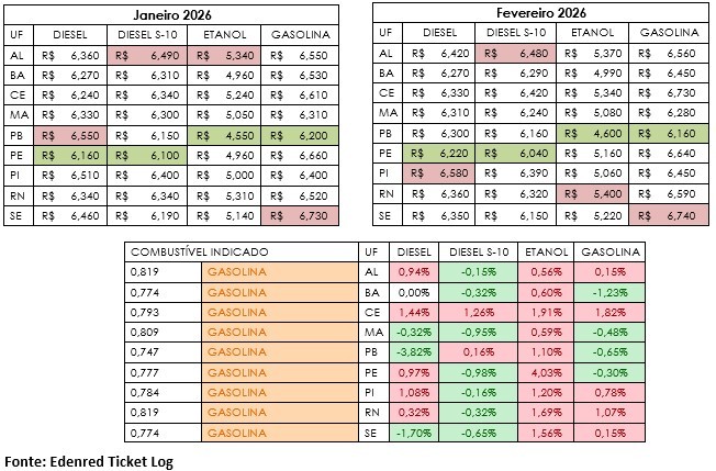 Dados da mais recente análise do Índice de Preços Edenred Ticket Log (IPTL), levantamento que consolida o comportamento de preços das transações nos postos de combustível e traz uma média precisa, apontam que, em fevereiro, o Nordeste apresentou um cenário de alta para os combustíveis, na comparação com janeiro, com exceção somente do diesel S-10, que registrou leve queda no período. A região liderou o aumento do etanol entre todas as regiões brasileiras no período, além de ter sido a única onde o diesel comum ficou mais caro.