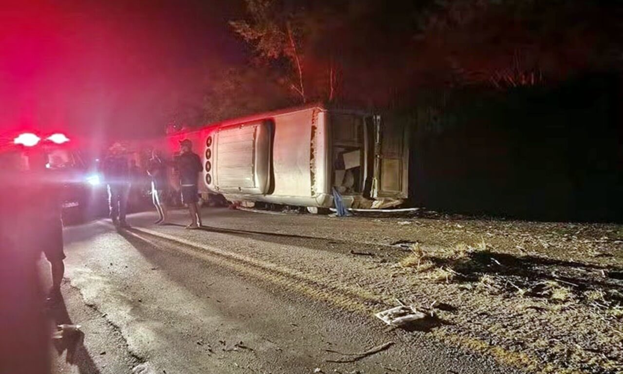 Veículo com cerca de 40 passageiros perdeu o controle e tombou após bater em barranco