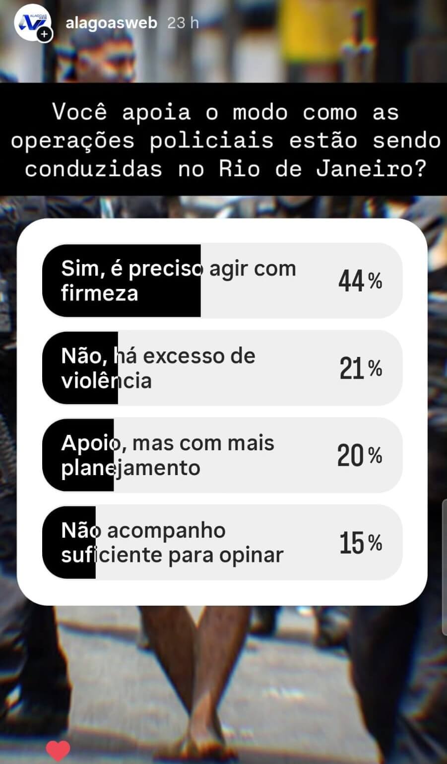 O AlagoasWeb promoveu uma enquete no Instagram perguntando: “Você apoia o modo como as operações policiais estão sendo conduzidas no Rio de Janeiro?” — a reação do público mostrou apoio majoritário à atuação enérgica das forças de segurança, mas também uma fatia relevante de preocupação com excessos e necessidade de planejamento.