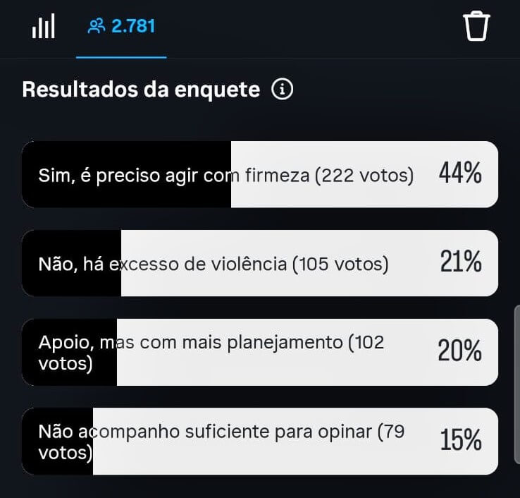 Apoio majoritário, mas não unânime. A opção “agir com firmeza” liderou com 44% — é o resultado mais expressivo, mostrando que entre os que votaram há uma tendência a favorecer ações de repressão mais duras. Entretanto, 41% (soma de 21% + 20%) manifestaram preocupação — seja por entender que houve excesso de violência, seja por defender ação com mais planejamento. Isso demonstra que o apoio não é absoluto e que há demanda por equilíbrio entre rigor e garantias legais/planejamento.