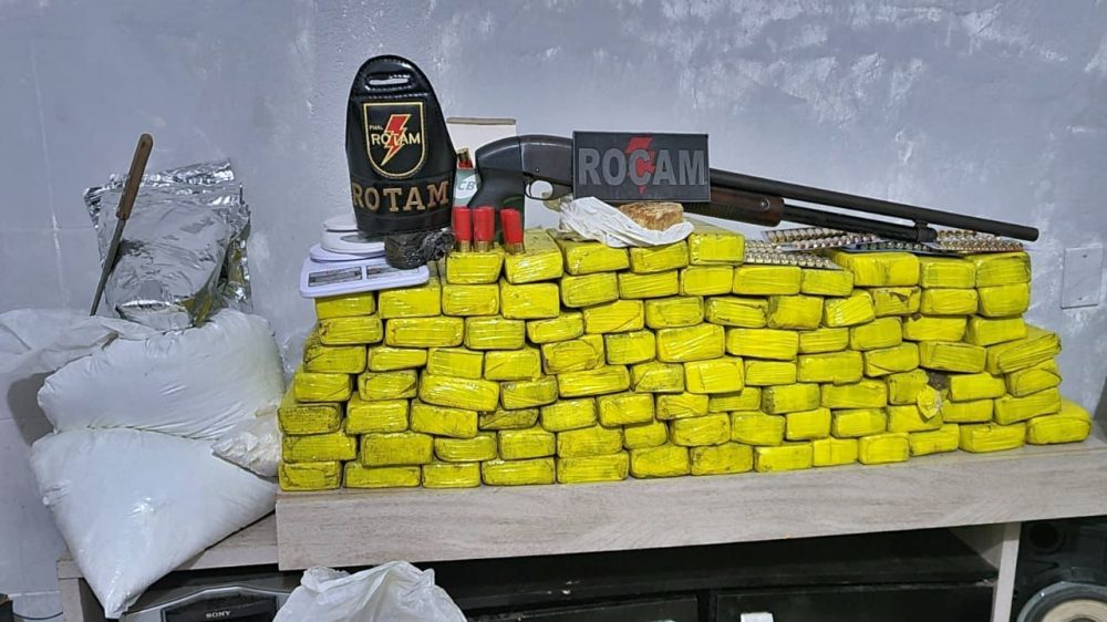 Uma espingarda calibre 12 com numeração ilegível e uma pistola com numeração suprimida também foram apreendidas, além de dois carregadores de pistola 45, duas balanças de precisão e uma prensa. O veículo Polo foi recolhido.