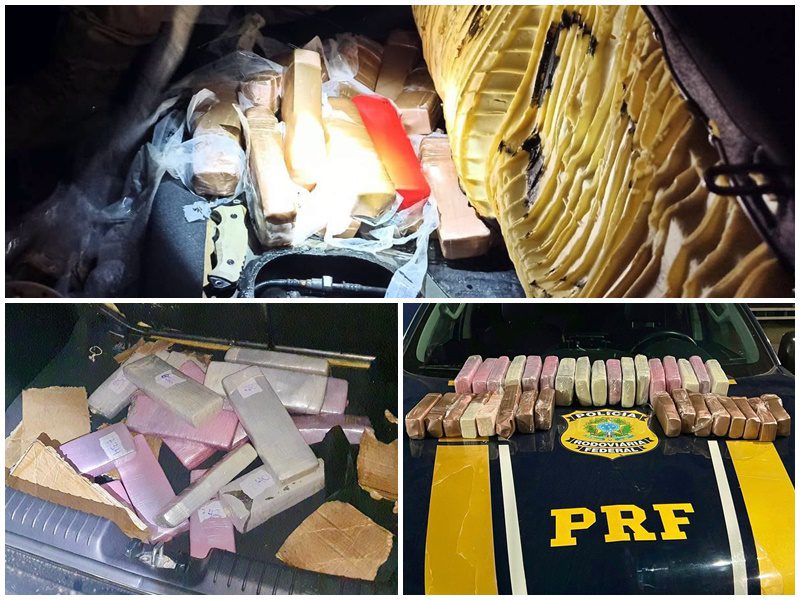 Ao aprofundar a fiscalização, dentro do veículo a polícia encontrou, no interior do banco traseiro 13,3 kg de substância análoga a maconha além, no compartimento do tanque de combustível, mais 8,4 kg substância análoga a pasta base de cocaína.