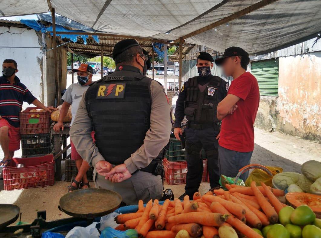 Dois homens, que não utilizavam o equipamento de proteção na feira livre, foram notificados pela Polícia Militar, através da 1ª Cia Independente e Guarda Civil Municipal (GCM).