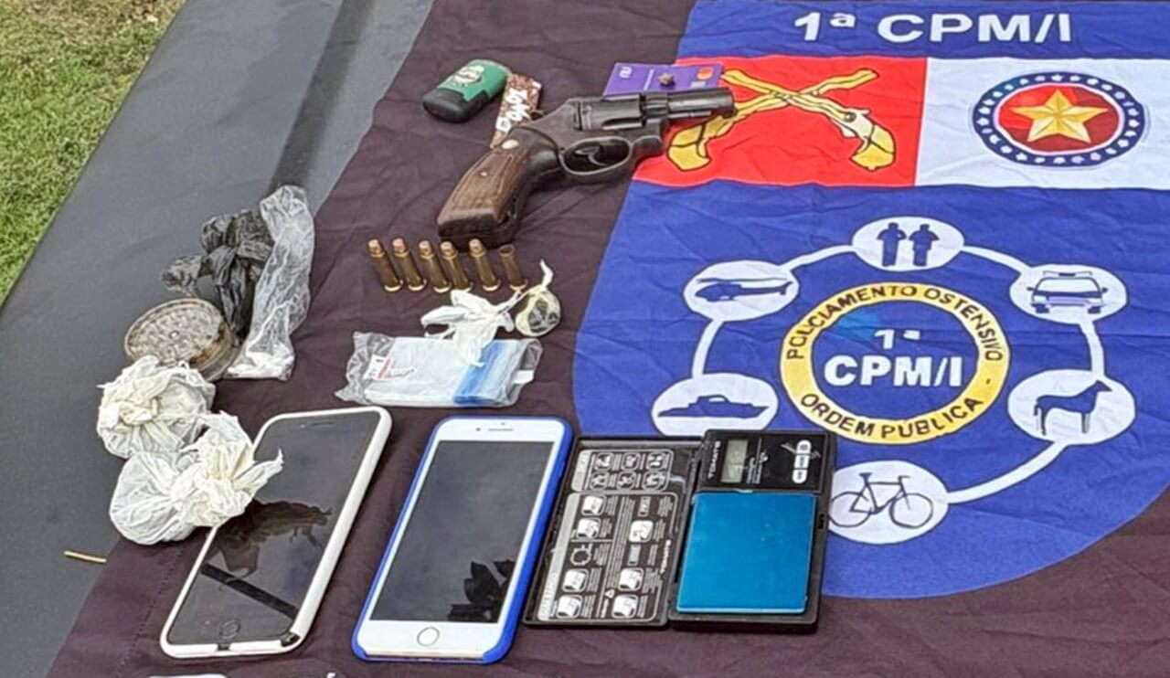 Um revólver calibre 38, usado pelo jovem para atirar nos policiais, foi apreendido. A arma estava com seis munições, sendo uma deflagrada. Com ele a PM ainda apreendeu uma quantidade de drogas, uma balança de precisão e outros materiais ilícitos.