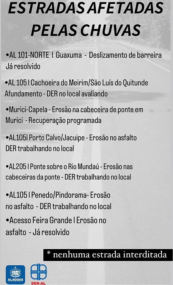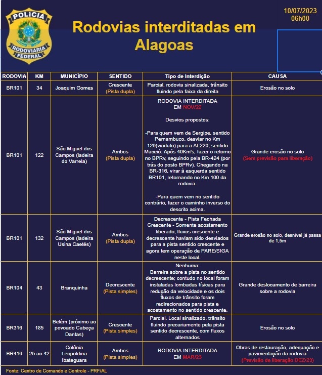 A Polícia Rodoviária Federal (PRF), atualizou, na manhã desta segunda-feira, dia 10, os trechos que seguem interditados das rodovias federais e que cortam Alagoas.