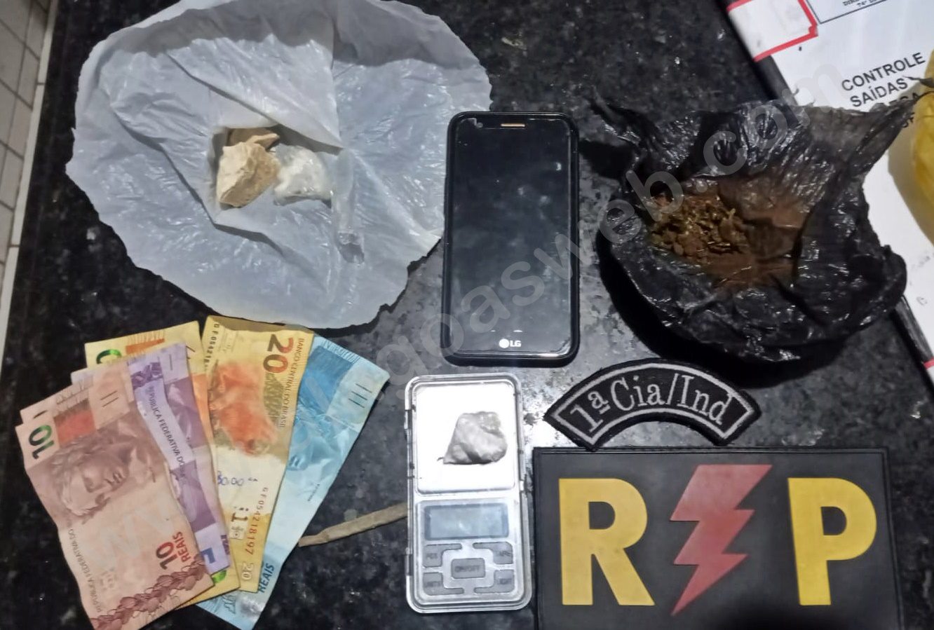 Após abordar o suspeito e realizar buscas no perímetro, a PM encontrou o material ilícito e na revista pessoal, uma quantia em dinheiro, supostamente resultado da venda de drogas.