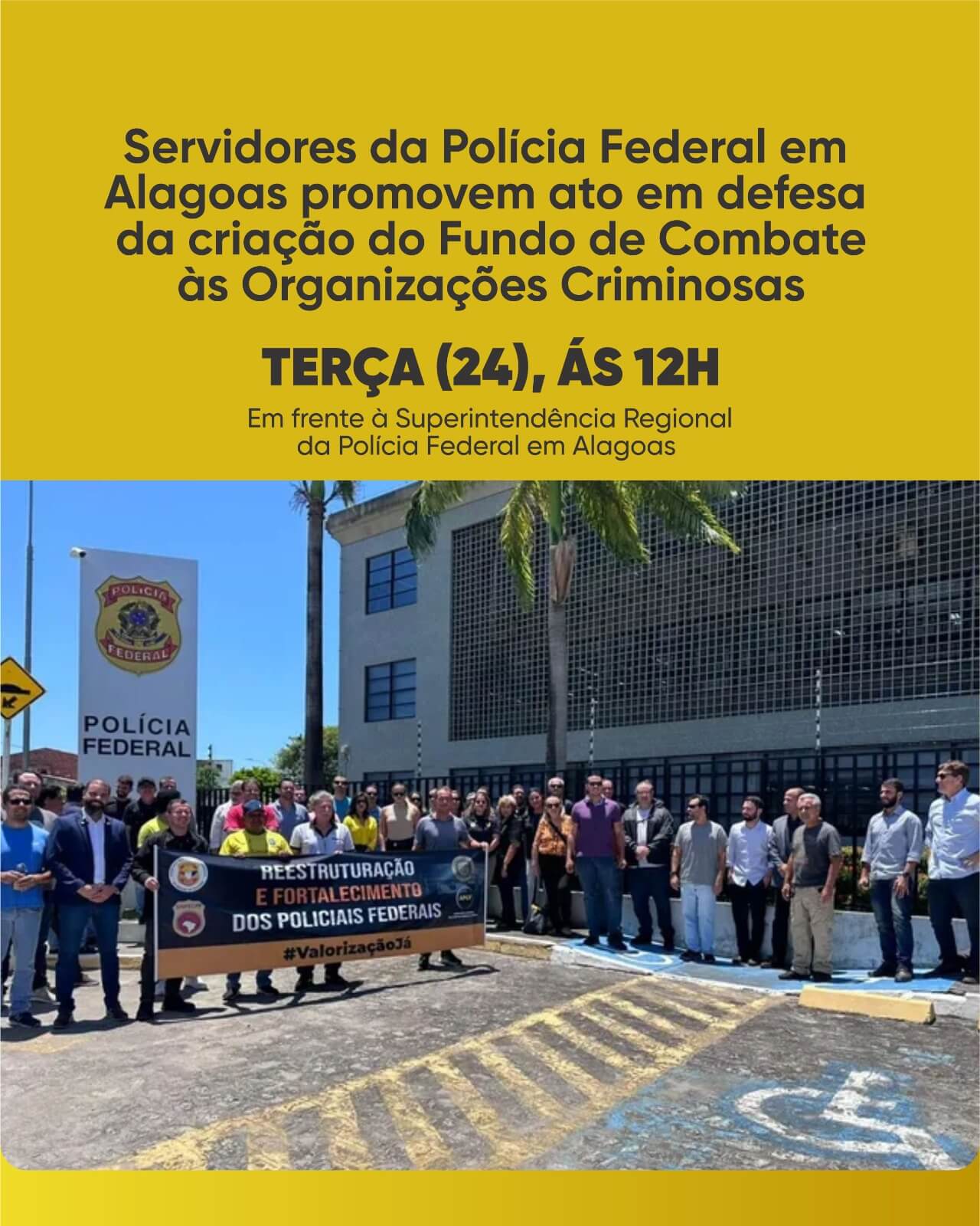 Os servidores da Polícia Federal realizam, nesta terça-feira (24), a partir das 12h, uma manifestação em frente à Superintendência Regional da Polícia Federal em Alagoas, no bairro de Jaraguá, em Maceió. O ato defende a criação do Fundo de Combate às Organizações Criminosas (Funcoc).