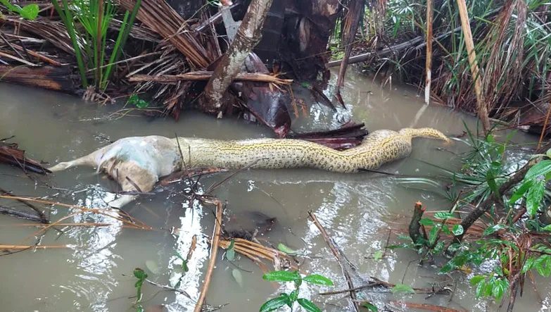 O ataque aconteceu dentro do próprio córrego. O cão foi engolido pela metade, mas a cobra não conseguiu terminar a refeição - ou ainda tentou vomitar.